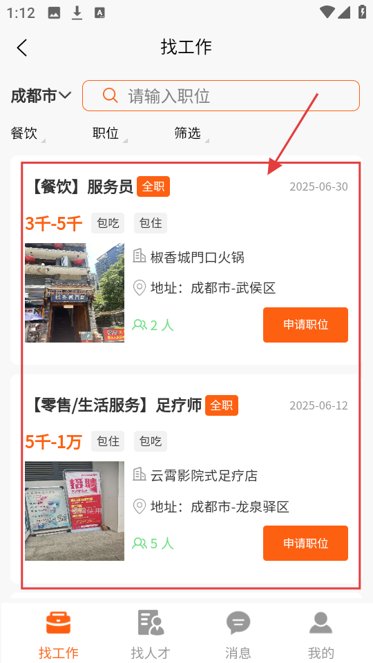 3、找工作时,在【找工作】板块按餐饮、零售等行业筛选,浏览合适职位列表。