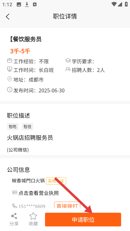 4、进入职位详情页,确认工作经验、薪资等符合预期,点【申请职位】投递简历。