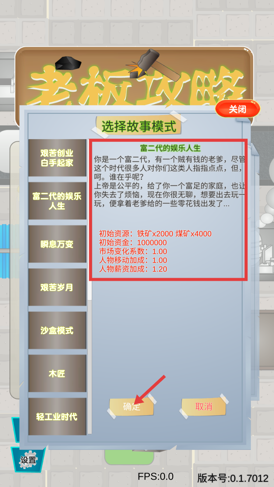 2、选择【富二代的娱乐人生】故事模式,该模式初始有铁矿×2000、煤矿×4000等丰富资源,点击【确定】进入。