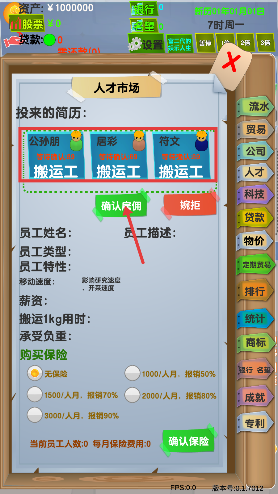 3、在人才市场,有公孙朋、居彩、符文等搬运工待雇佣,点击【确认雇佣】可招募员工来搬运资源。