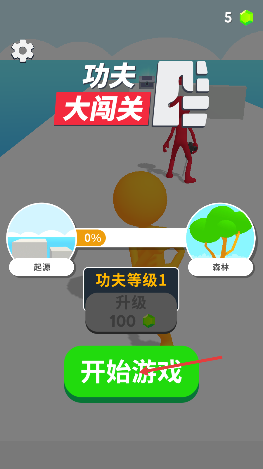 1、点击【开始游戏】进入【功夫大闯关】,当前功夫等级1,可从【起源】场景开启关卡挑战。
