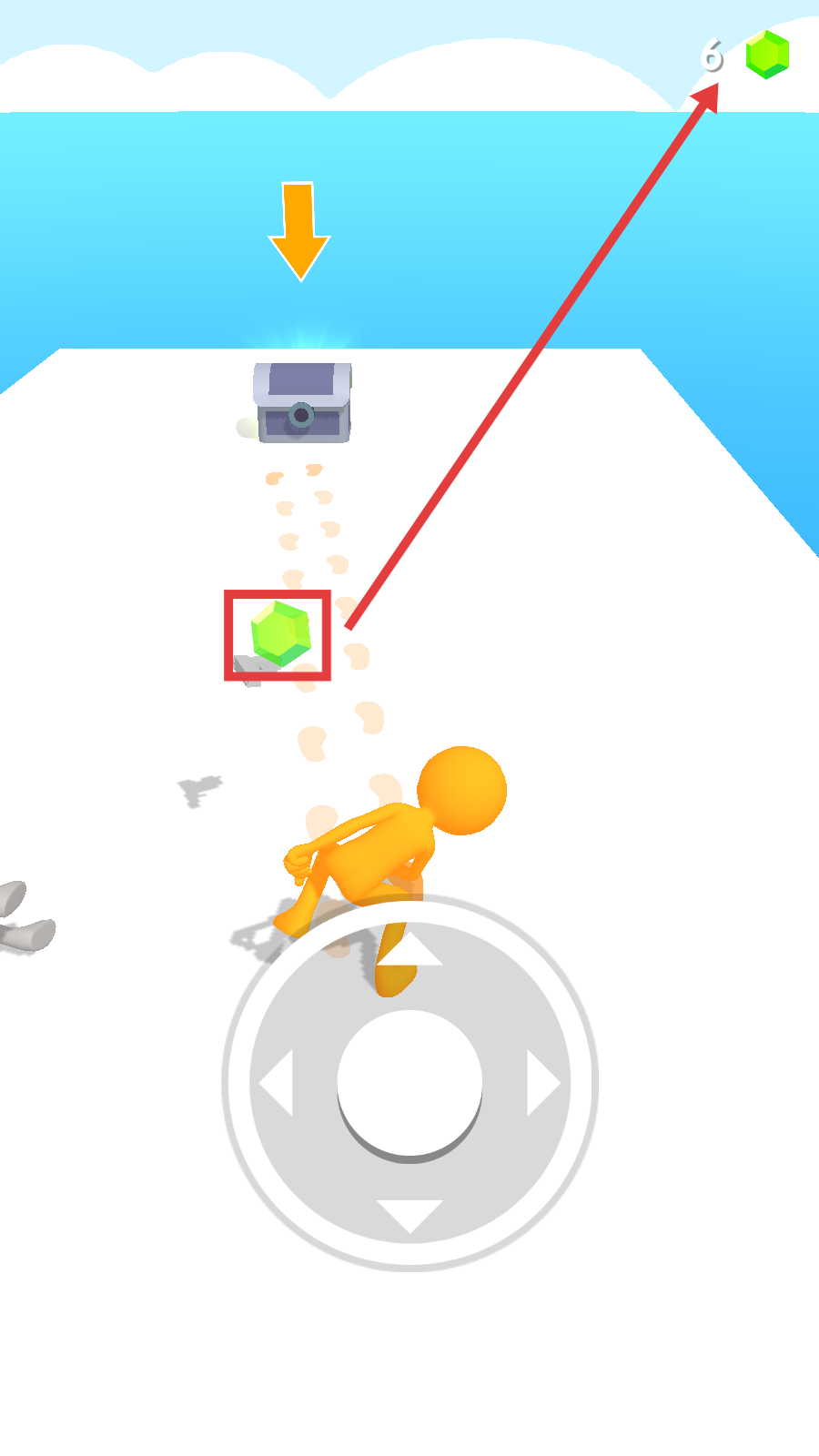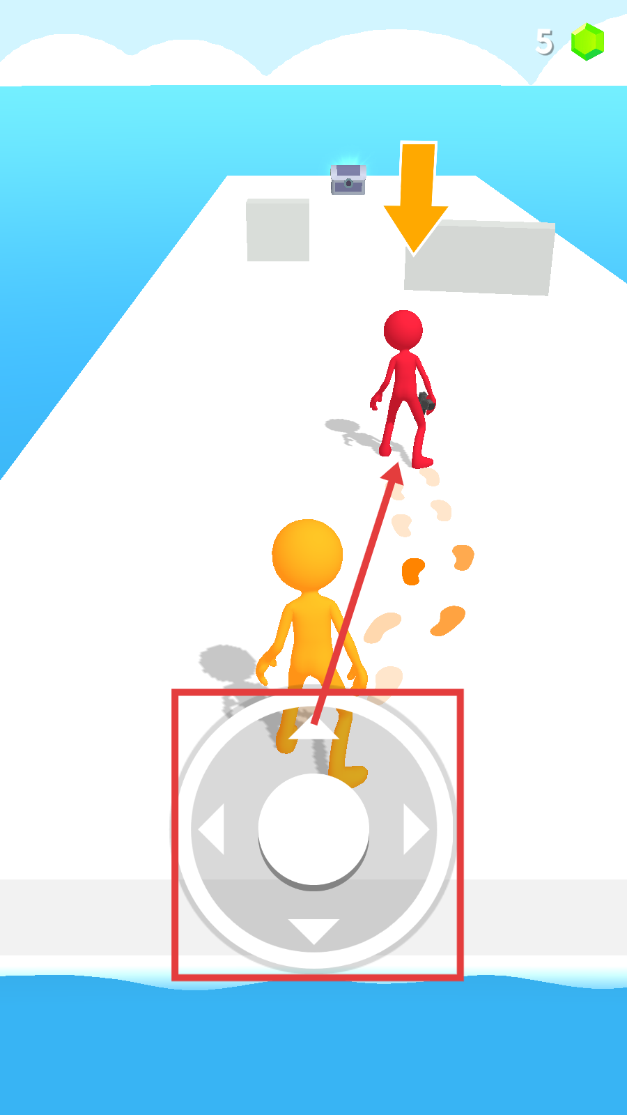 2、通过下方轮盘操控角色移动,朝着前方目标方向前进,追赶红色角色推进关卡。