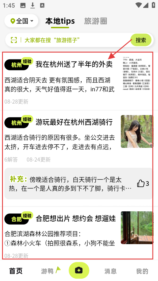 1、想获取旅游经验,先在【本地tips】板块,浏览各地旅游分享,找目标城市攻略。