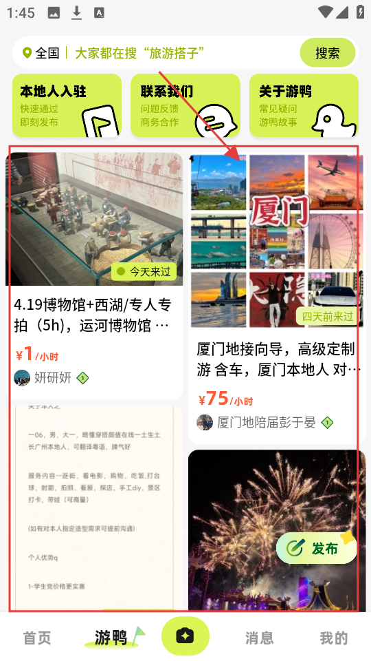 3、想找当地特色旅游服务,在首页选对应城市板块,浏览导游、定制游等服务信息。