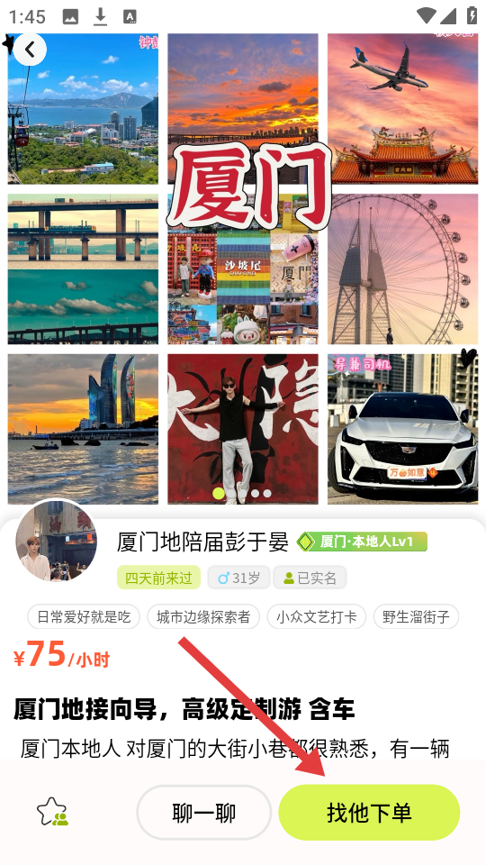 4、选好当地旅游服务后,若满意,点【找他下单】,和服务提供方对接,开启定制旅游。