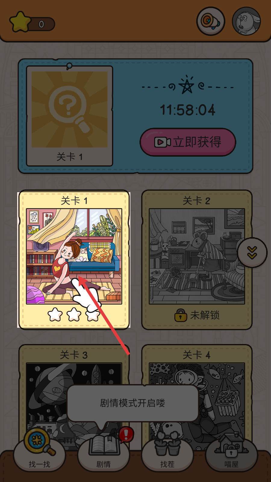 1、点击【关卡1】进入游戏,剧情模式已开启,可开始第一关的探索挑战。
