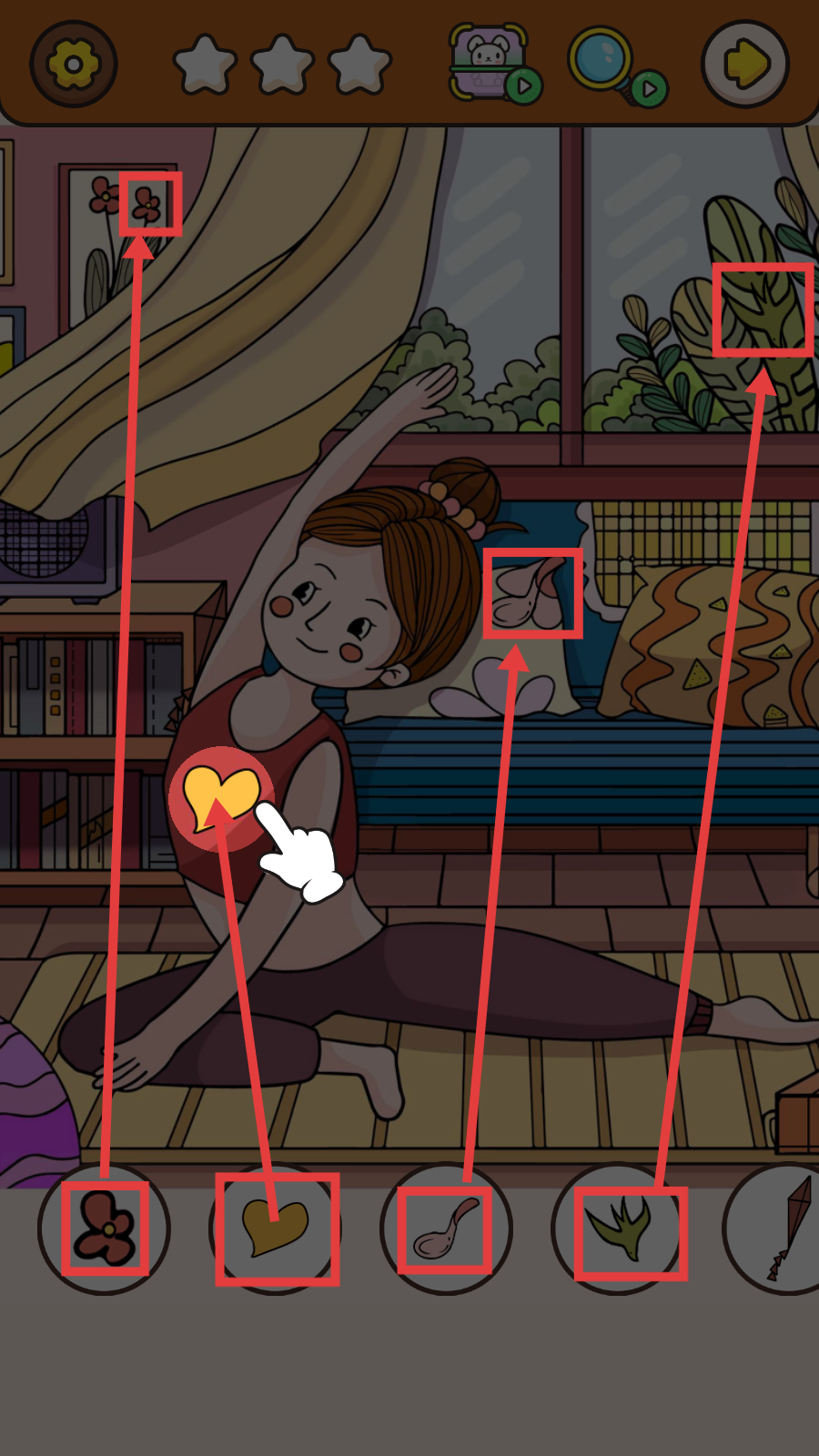 3、根据下方图标,在画面中寻找对应物品,如心形、花朵等,点击物品所在位置。