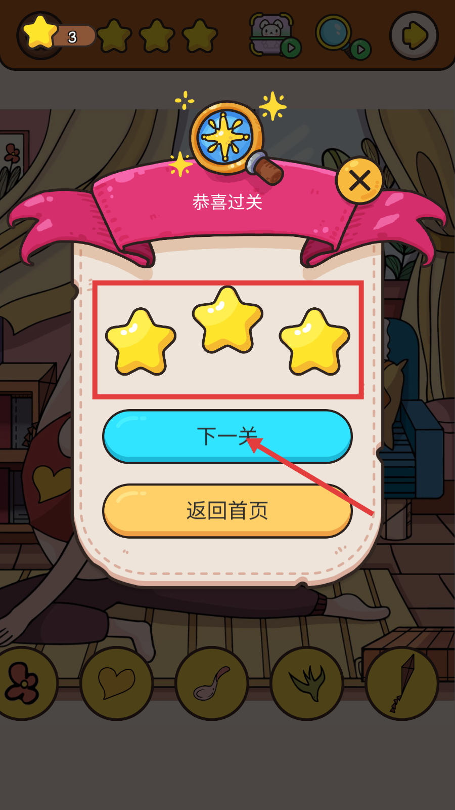 4、通关后获得三星评价,点击【下一关】可继续挑战,也可选择返回首页。