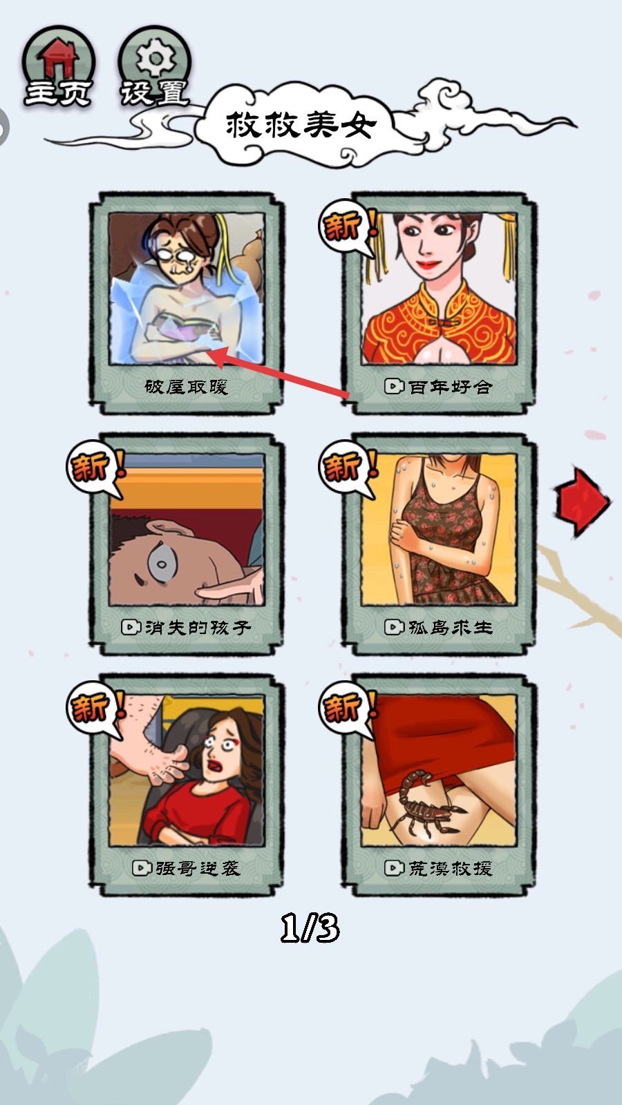 1、选择【破屋取暖】关卡进入游戏,开启“救救美女”系列的破屋取暖挑战,准备帮助角色取暖。
