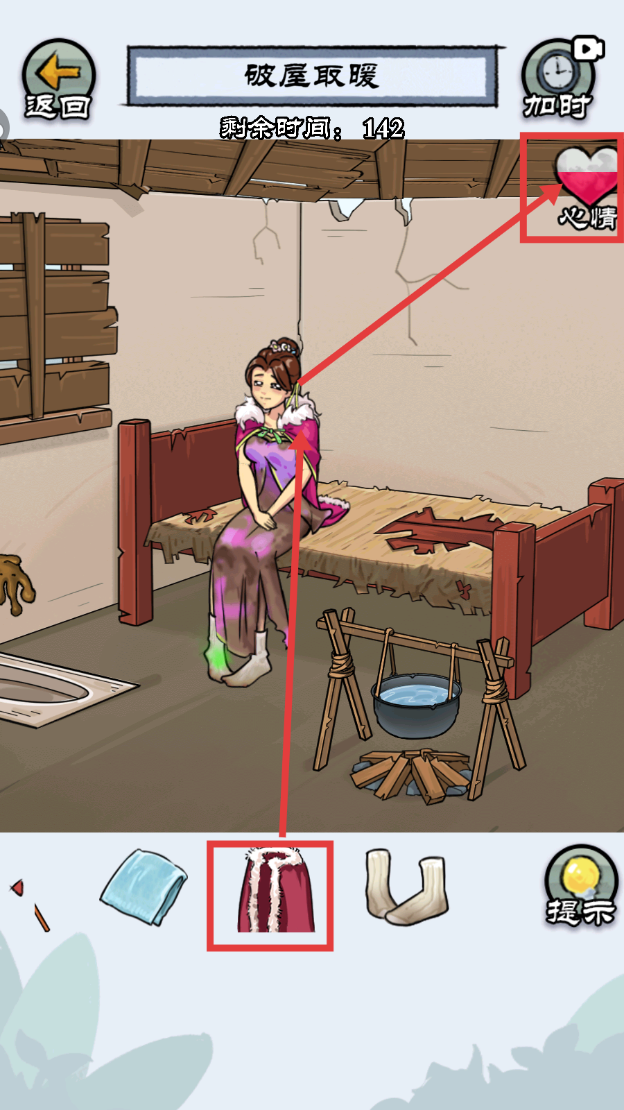 3、在关卡中,为角色穿上衣物等物品,能提升右上角的【心情】值,助力完成破屋取暖的目标。