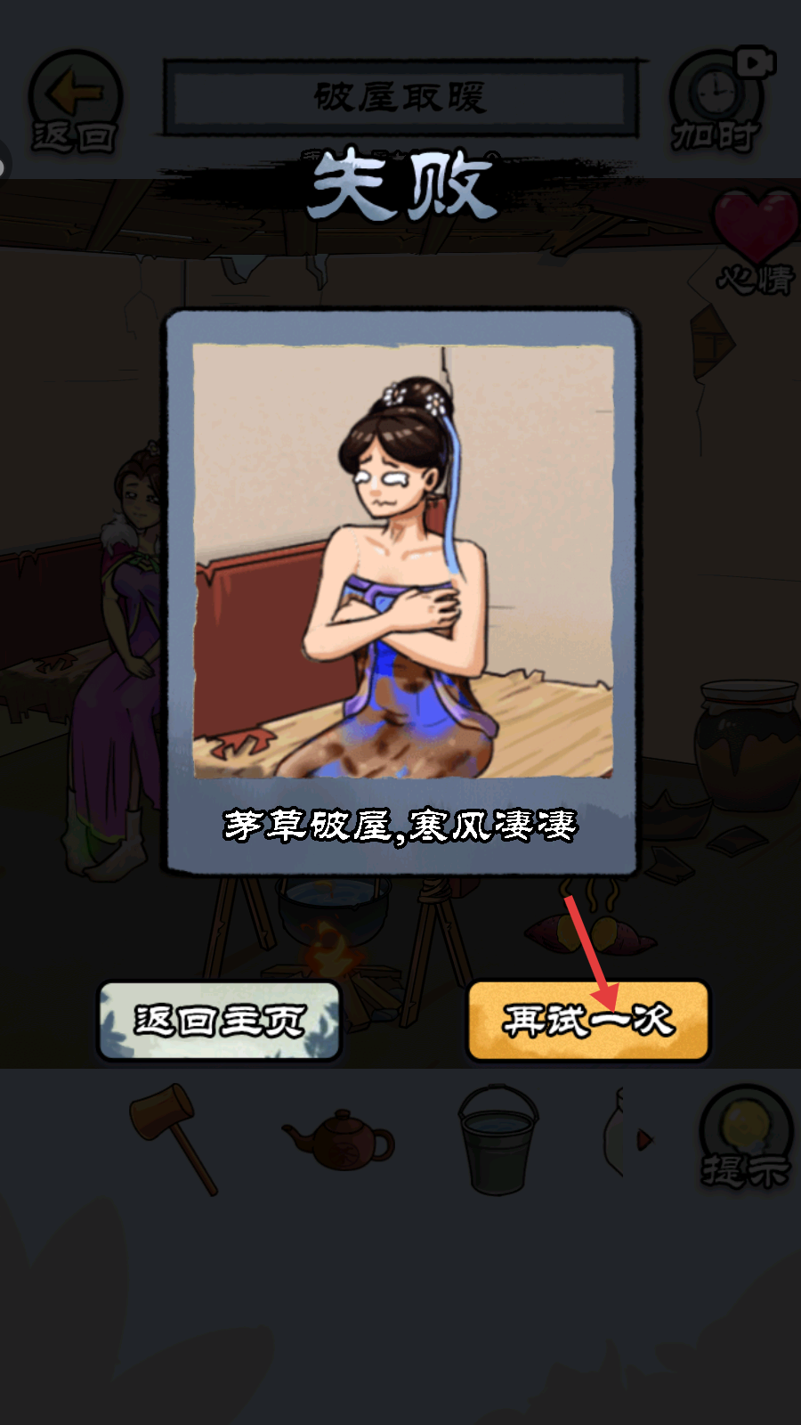 4、若挑战失败出现【失败】提示,可点击【再试一次】重新挑战,继续尝试帮助角色在破屋中取暖。