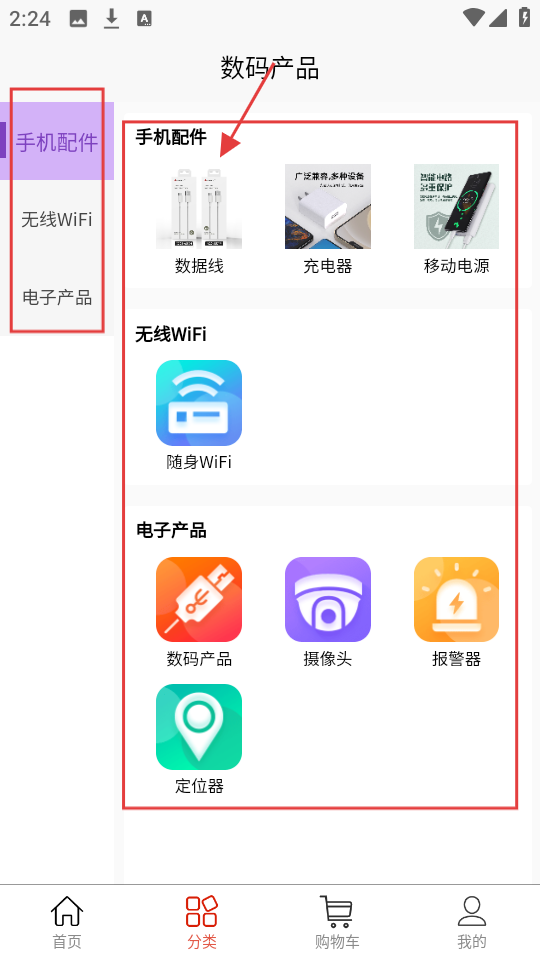 1、想买数码产品,先在分类页选【手机配件】【无线WiFi】等分类,找对应商品板块。