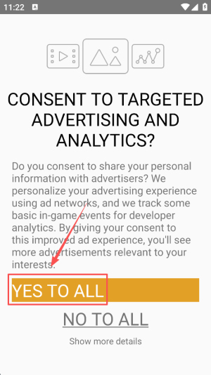1、首先,同意个性化广告和分析的条款,点击“YES TO ALL”以继续。