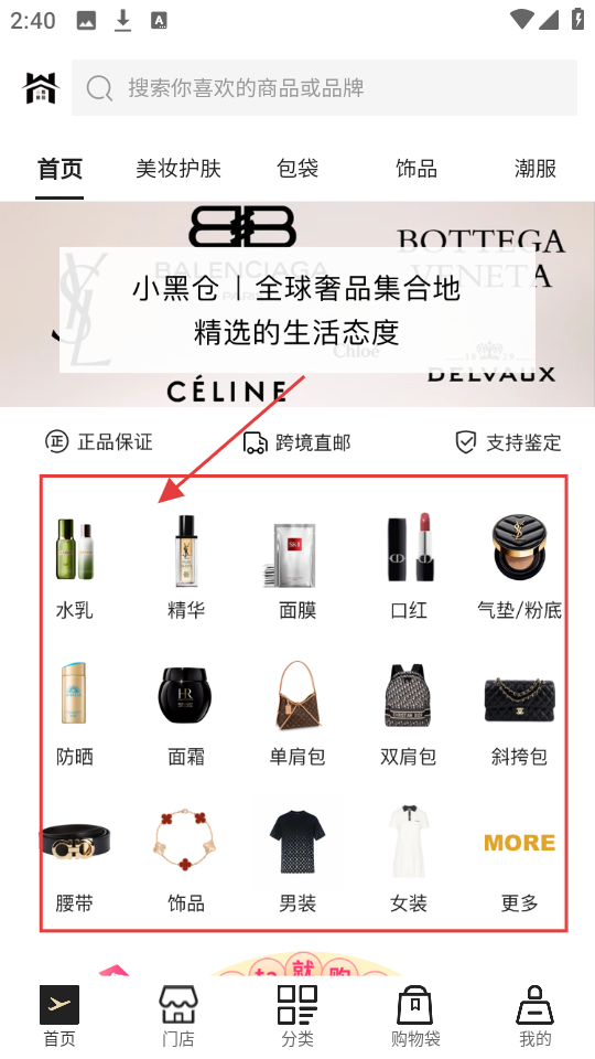 1、想逛奢品,先在首页选分类,从【水乳】【精华】等分类里,找感兴趣的商品类型。