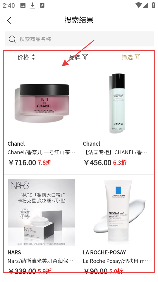 2、搜索后,在商品列表里,对比不同品牌商品的价格、折扣,挑选心仪的那一款。