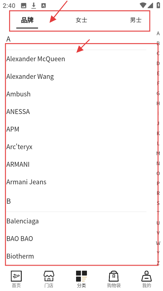 4、若想找特定品牌,可在品牌列表里,按字母或分类,选对应的品牌去浏览商品。