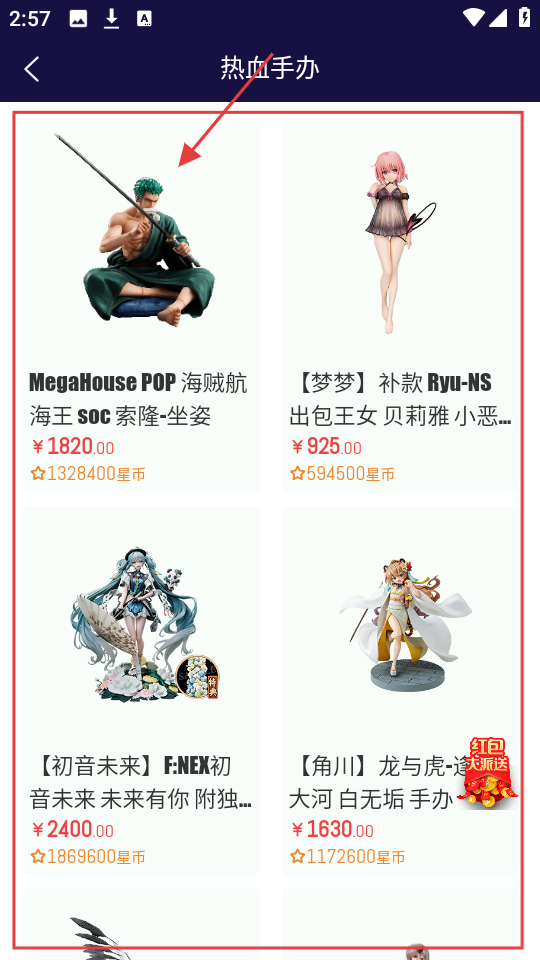 2、进入手办专区后,浏览手办列表,对比价格、星币数,挑选心仪的手办。