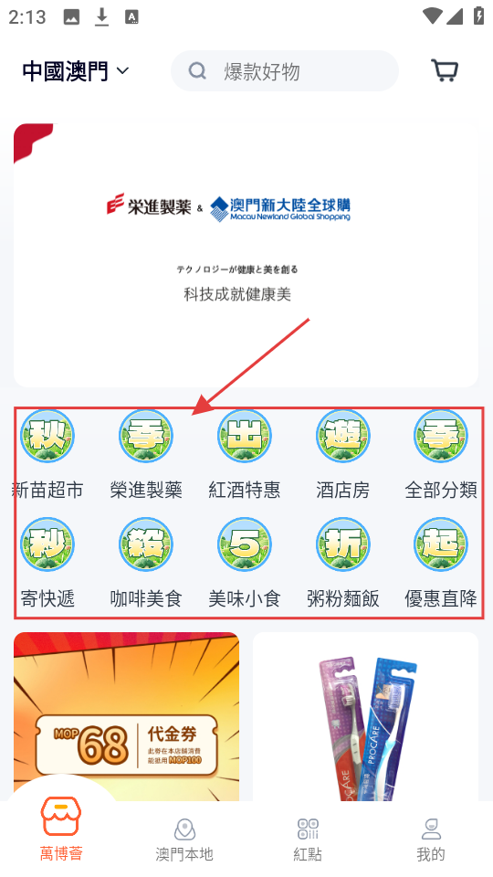 1、想购物先选分类,从【新苗超市】【榮進製藥】等分类里,找要逛的板块。