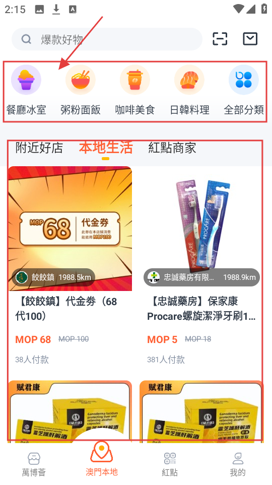 4、想找本地生活服务,选【餐廳冰室】【粥粉面飯】等分类,或看附近好店推荐。