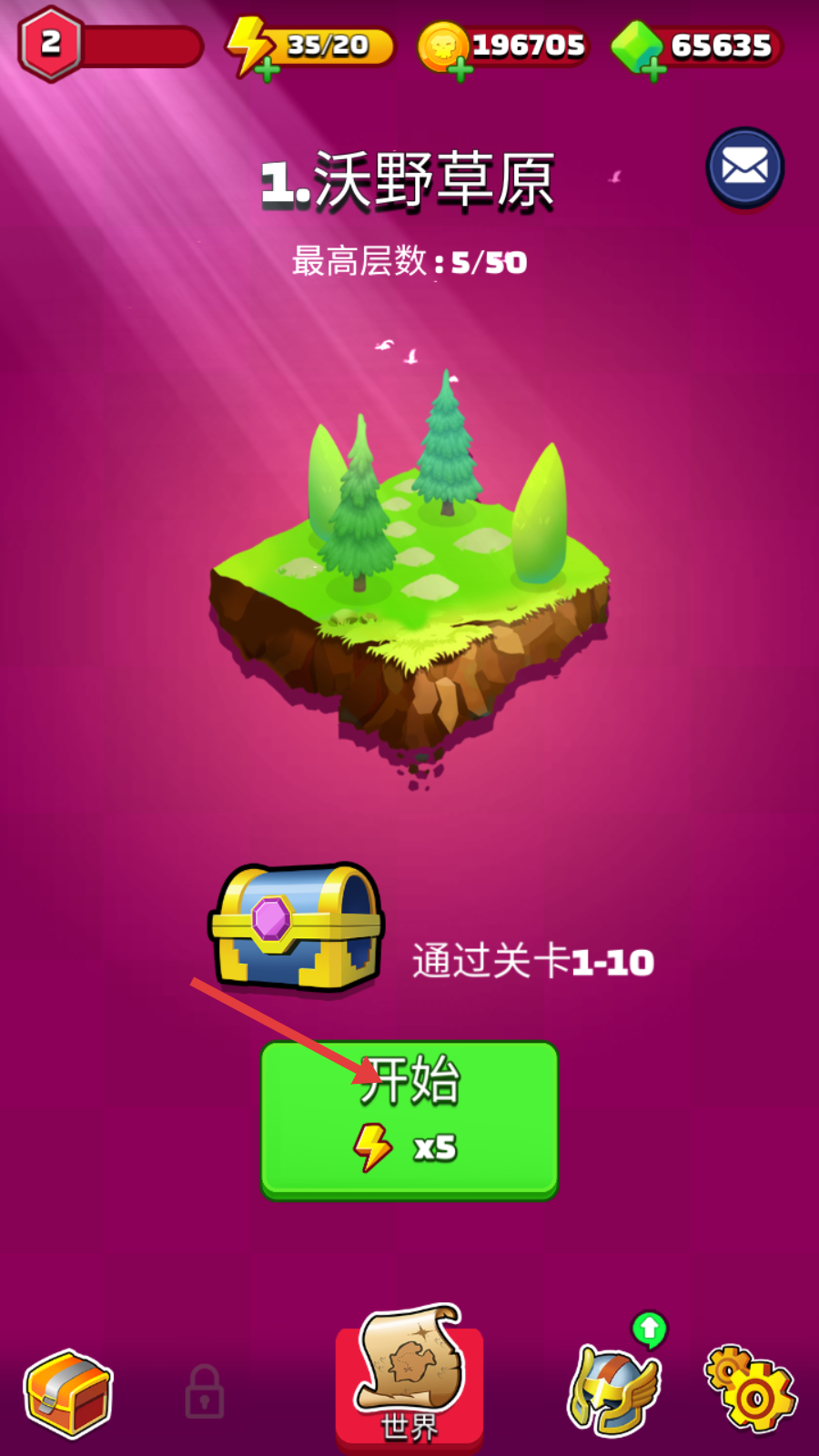 1、进入【沃野草原】关卡,点击绿色【开始】按钮(消耗5点闪电),开启关卡挑战,目标是推进层数。