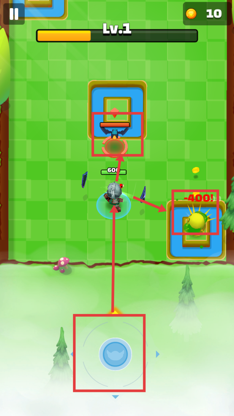 3、Lv.1关卡中,通过下方操作区域控制角色移动与攻击,瞄准敌人发起进攻,可对敌人造成伤害(如-400)。