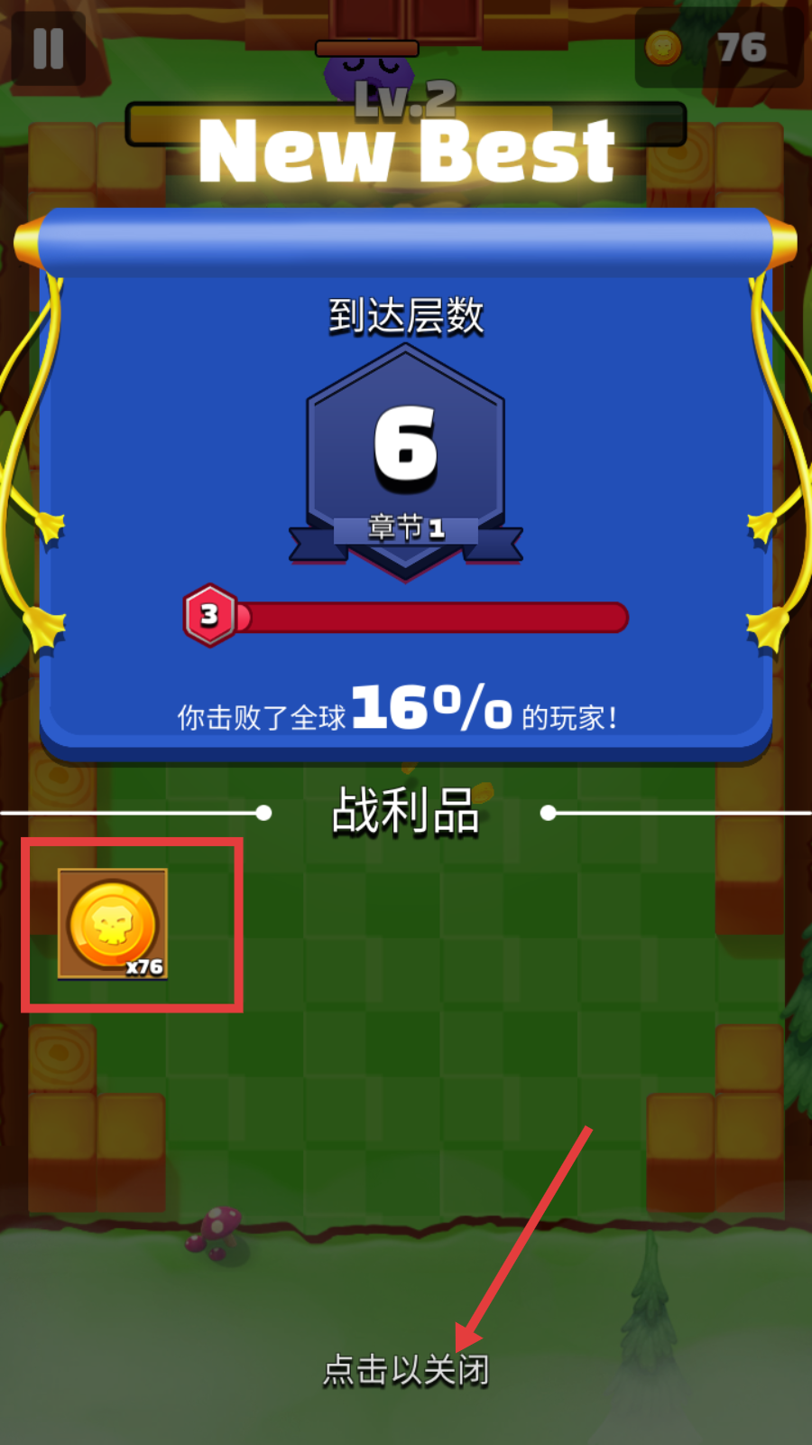4、通关后会显示【NewBest】,查看到达层数(如章节1层数6)与战利品(如金币×76),点击【点击以关闭】完成结算。