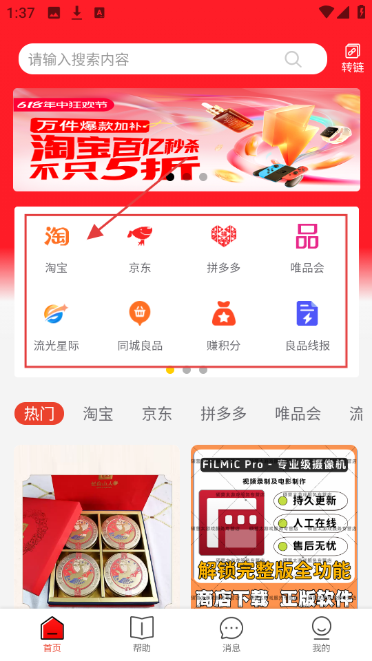 1、想找优惠商品,先选电商平台,从【淘宝】【京东】等入口进,再找对应活动专区。