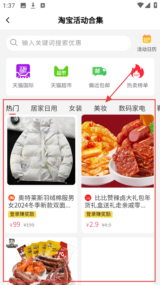 2、进入【淘宝活动合集】,按【热门】【居家日用】等分类,浏览心仪商品列表。