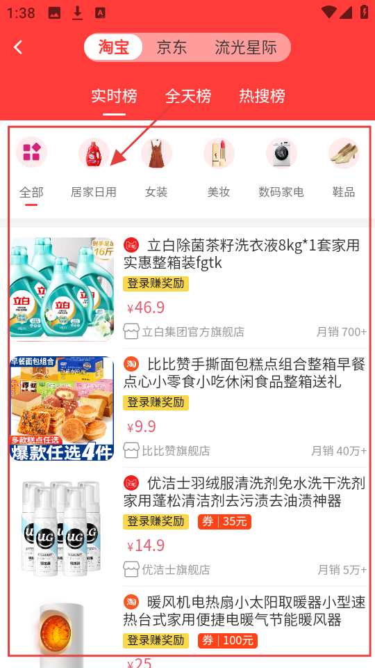 4、还可以查看热门榜单,选【居家日用】等分类,浏览该类下商品,挑中目标商品可进一步查看详情。