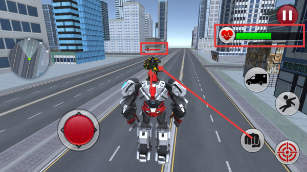 3、遇到敌方机甲时,注意右上角血量条,及时用右侧【拳头】图标发起攻击,同时留意敌方位置,合理进攻。