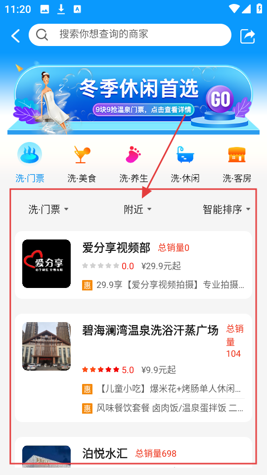 2、选择【洗门票】分类,能看到附近的商家列表,如“爱分享视频部”等,可查看商家评分、销量等信息。