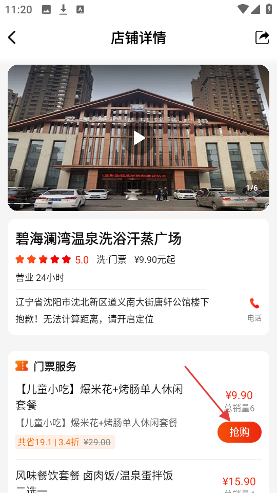 3、进入店铺详情页,可查看店铺评分、营业时间、地址等,还有门票服务如【儿童小吃】爆米花+烤肠单人休闲套餐,可点击【抢购】。