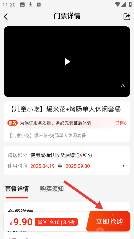 4、进入【儿童小吃】门票详情页,可查看套餐使用时间、赠送积分等信息,确认后点击【立即抢购】完成购买。