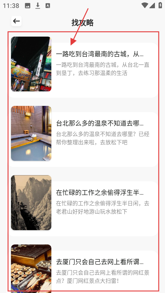 2、点击【找攻略】,能看到多条旅游攻略,如台湾古城美食攻略、台北温泉攻略等,可选择感兴趣的攻略查看。