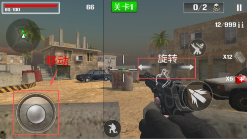 4、如何查看进度?在关卡界面观察“60/100”与“0/2”后操控“移动”完成击杀即可。