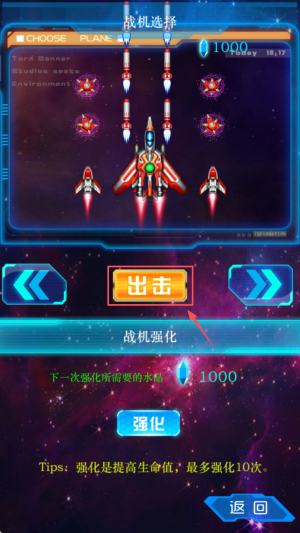4、如何强化战机?在“战机强化”界面投入1000金币点击“强化”即可提升生命值。