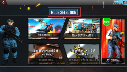 3、如何选择模式?进入“MODE SELECTION”,点击“SOLO MODE”即可开始单人战斗,其余模式达到等级后自动解锁。