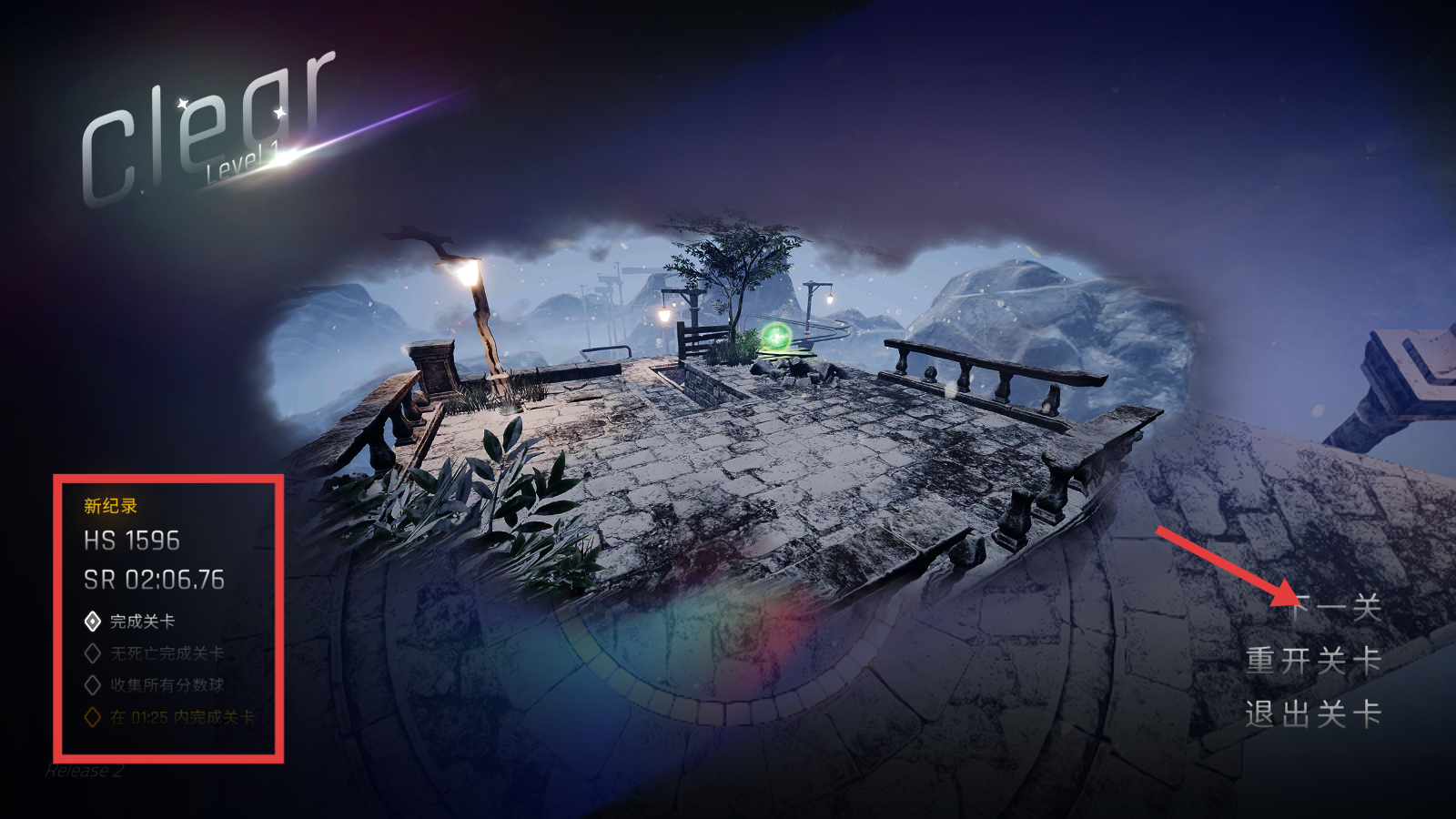 4、通关后会显示【clear】【新纪录】等成绩,还能选择【下一关】【重开关卡】或【退出关卡】,继续挑战或退出。