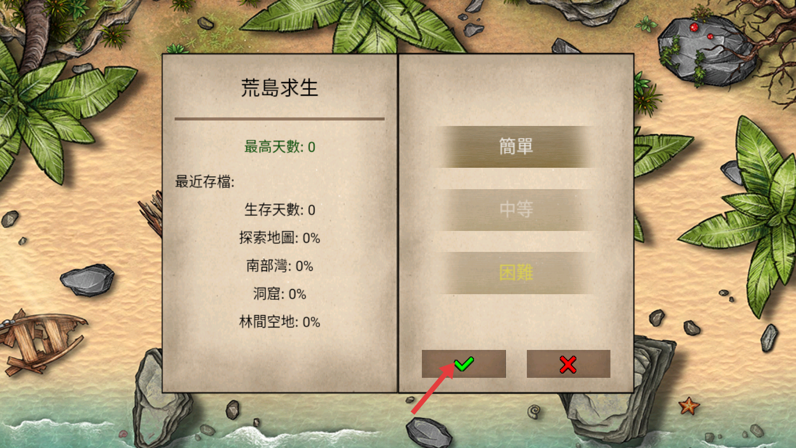 1、进入【荒岛求生】游戏,选择【困難】难度开启挑战,可查看最高天数、生存天数等存档信息。