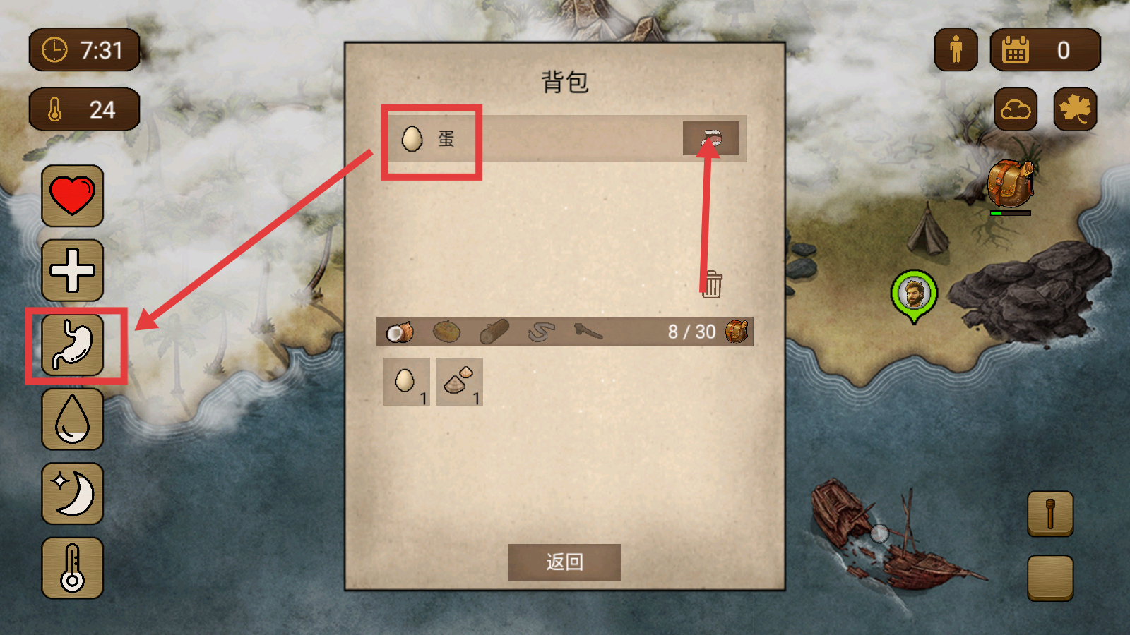 4、打开背包,点击【蛋】等资源,补充【飢餓】值维持生存,同时要合理管理背包内的资源。
