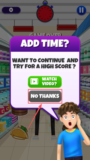 4、最后,如果时间用完,可以选择观看视频或点击“NO THANKS”来结束游戏。