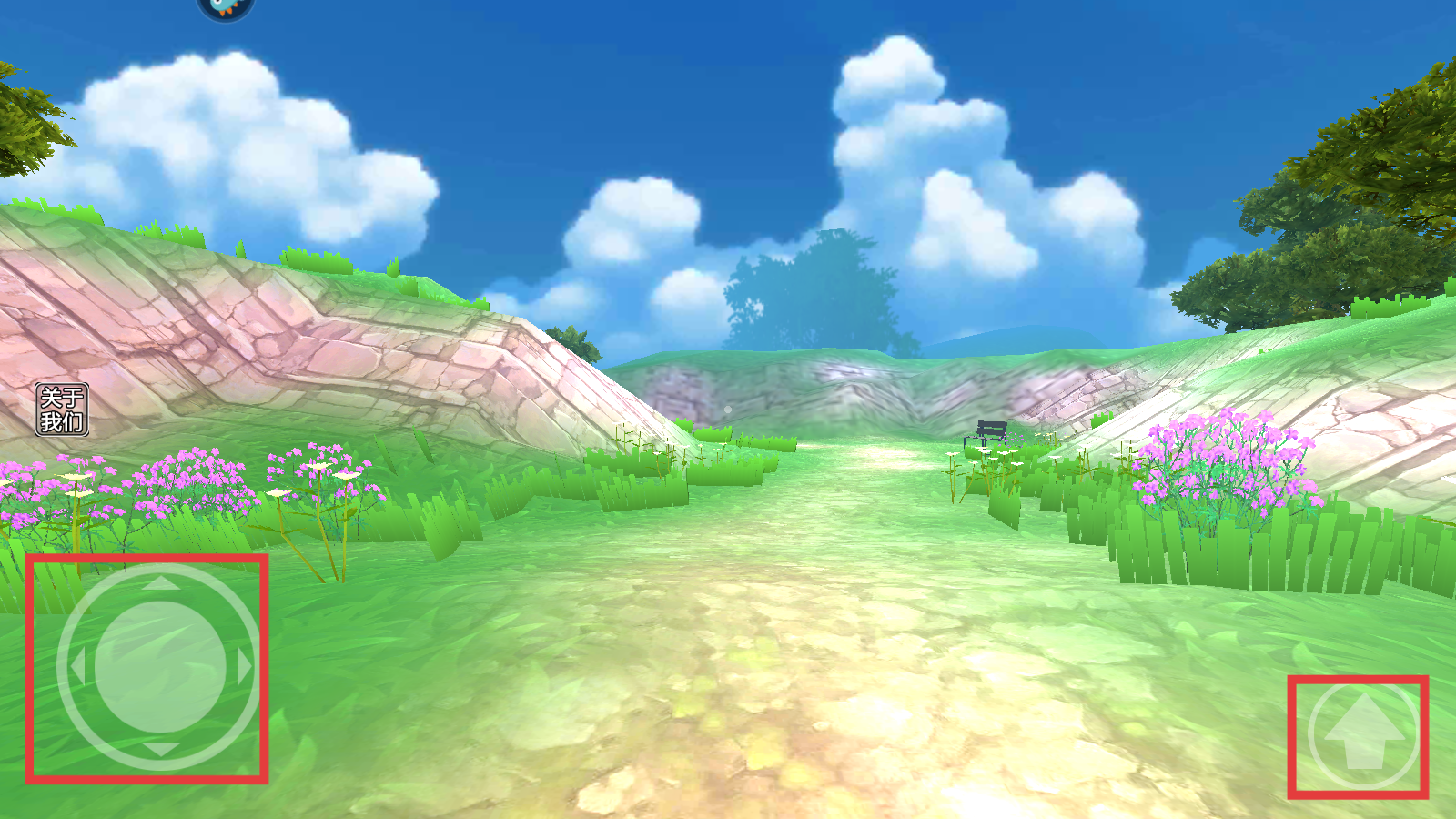 2、在户外场景时,利用左侧虚拟摇杆和右侧箭头按钮,操控角色移动,探索这片有花草、河流的区域。