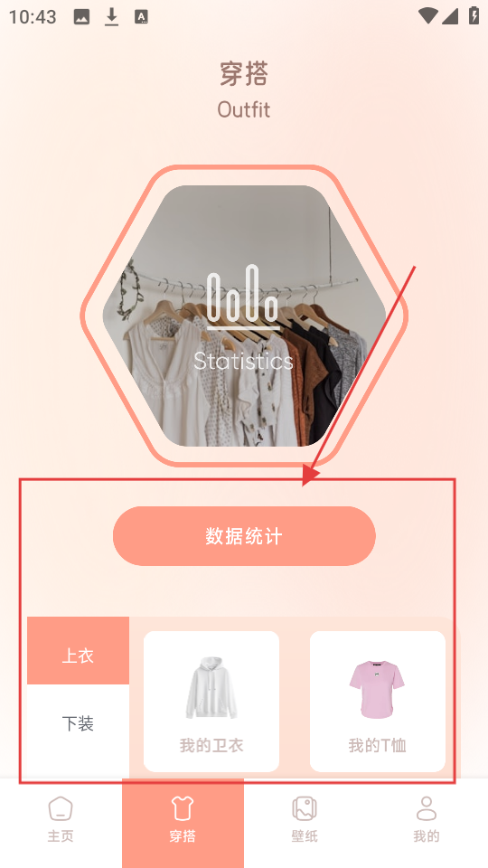4、若要管理穿搭,去穿搭页,可点【数据统计】了解穿搭情况,也能查看上衣等分类里的衣物。