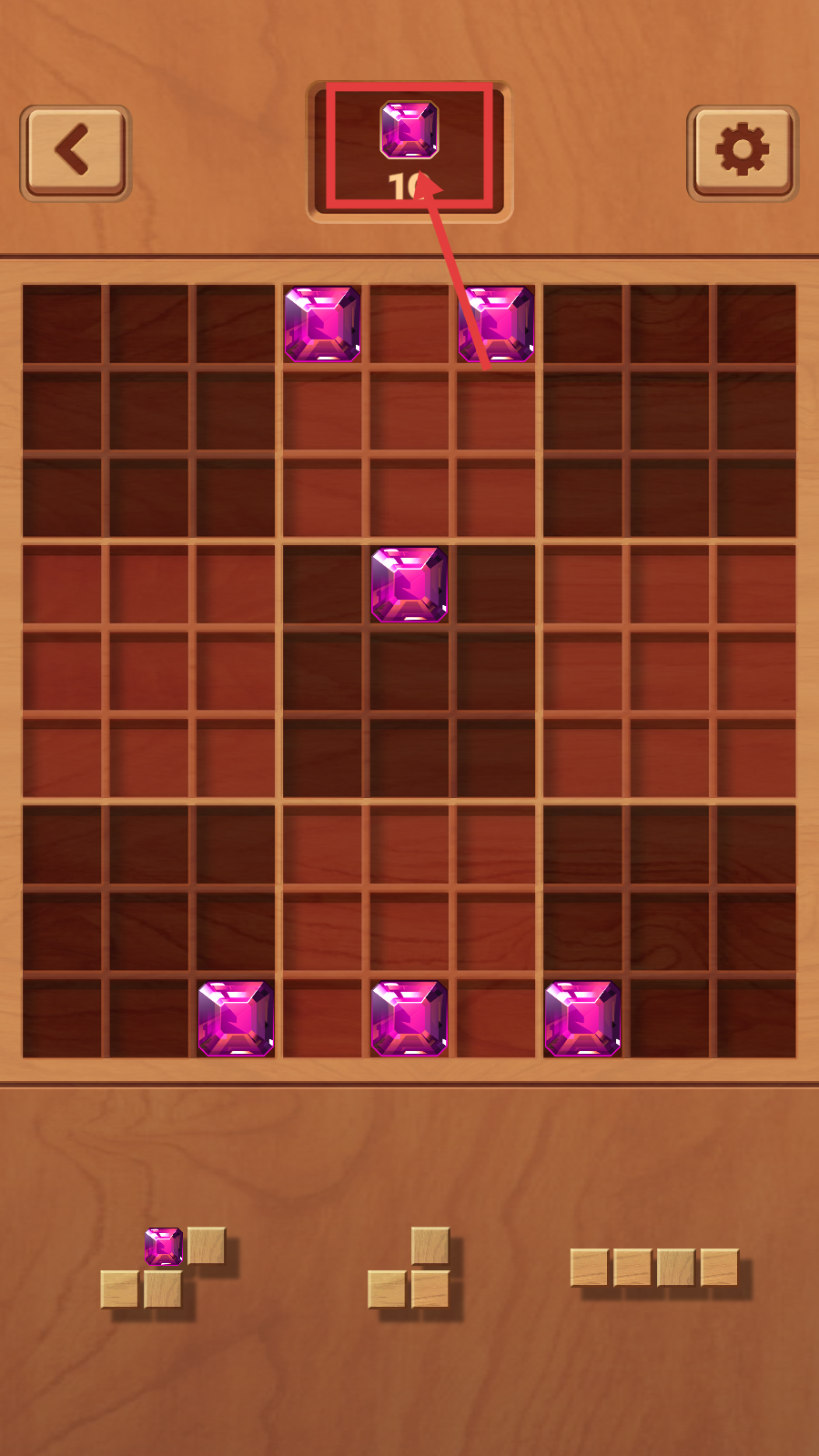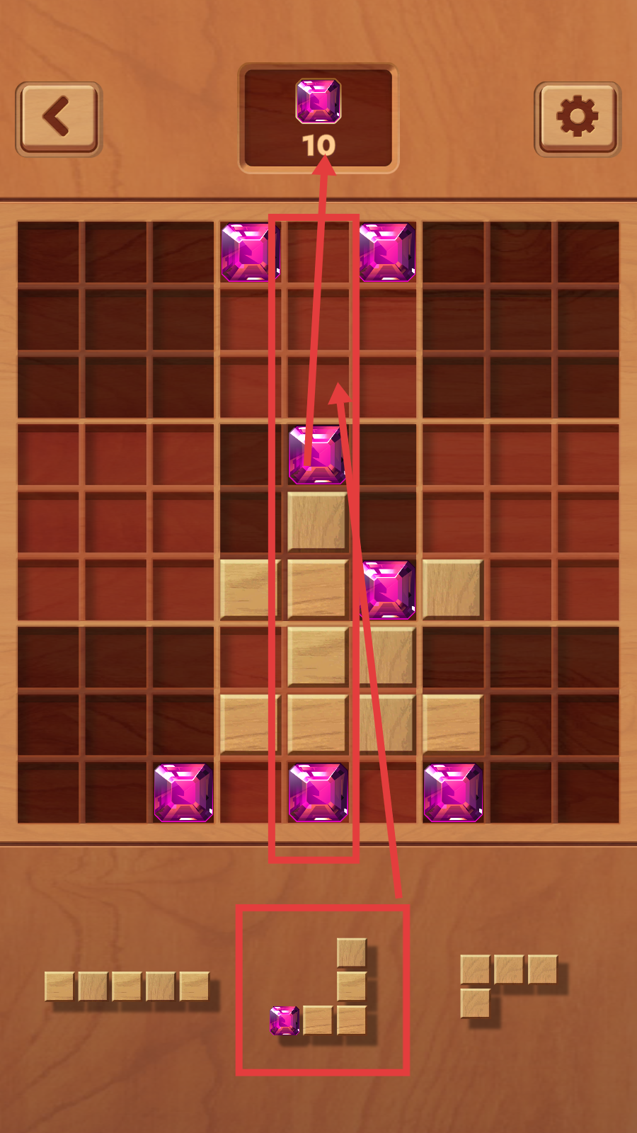 3、针对带紫色宝石的特殊形状木块,找准棋盘上的对应空位放置,助力收集宝石。
