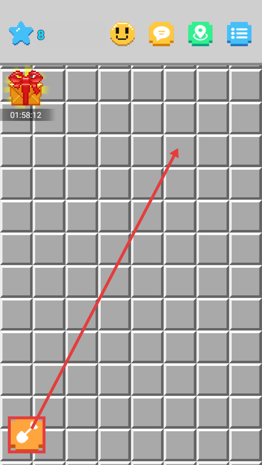 1、进入游戏,点击左下角铲子图标,探索灰色格子区域,同时留意左上角倒计时礼物,可获取奖励。