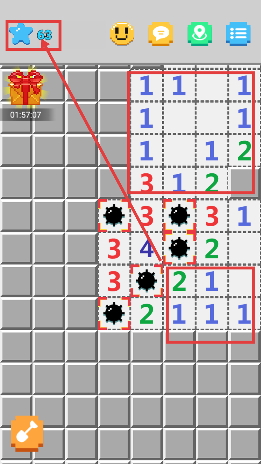 2、探索时,根据格子上的数字判断周围炸弹分布,安全点击格子收集星星,避开黑色炸弹区域。