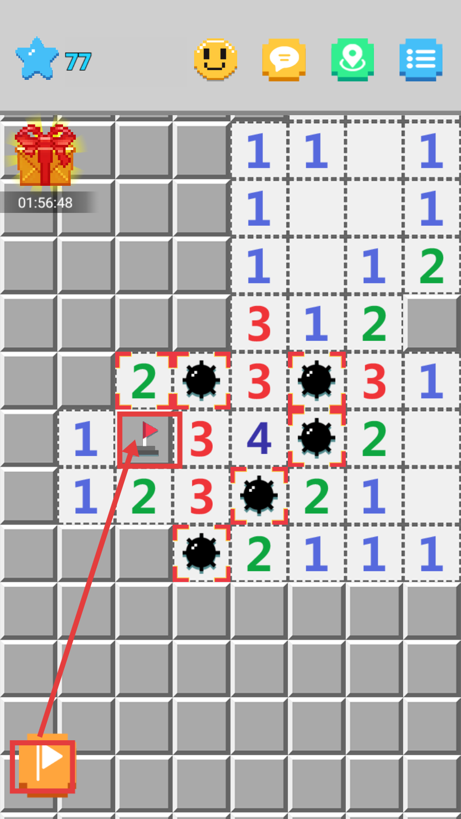 3、遇到需要标记的格子,点击左下角旗帜图标,在对应位置插旗,辅助判断炸弹位置,推进探索。
