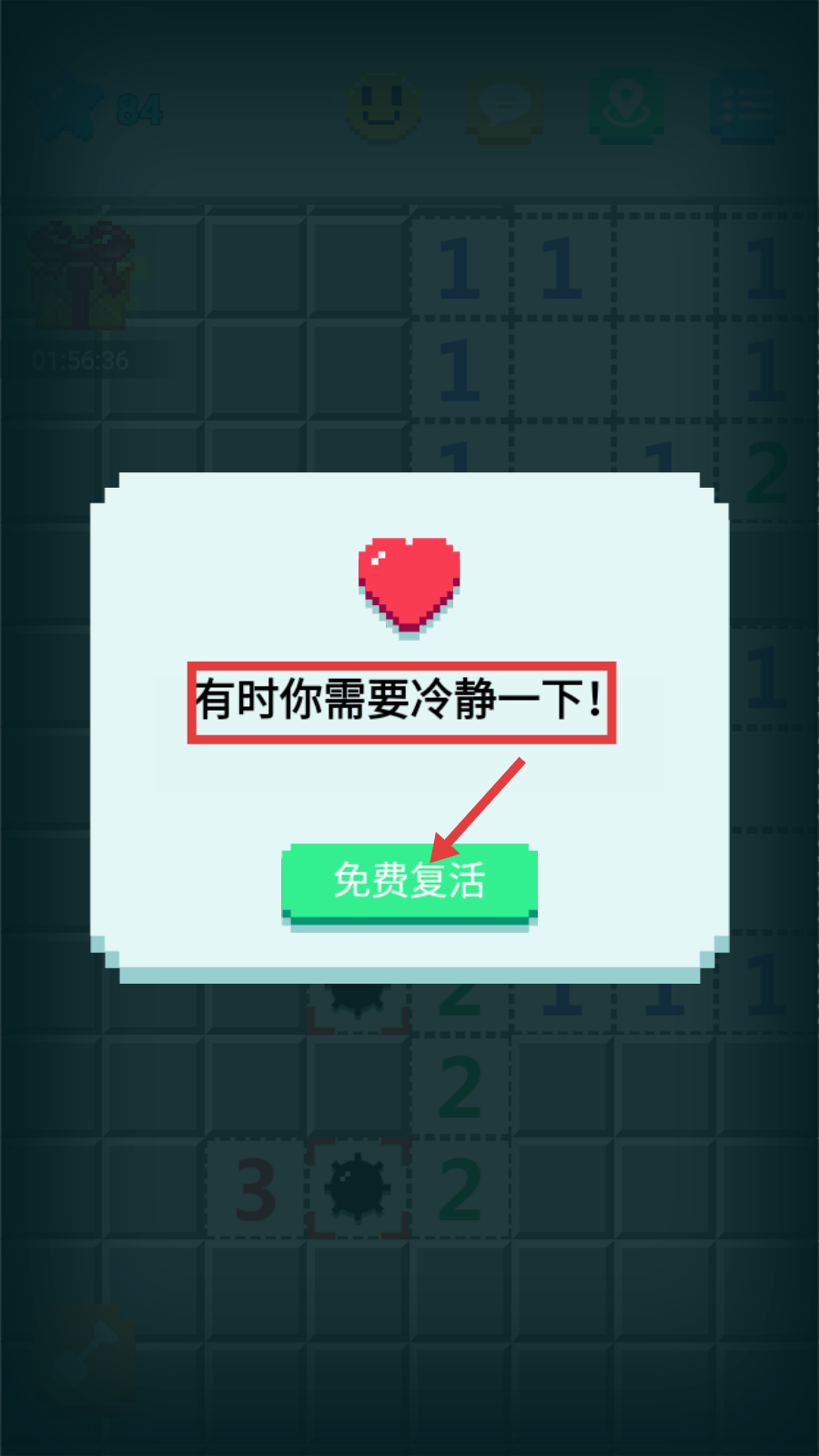 4、若触发“有时你需要冷静一下!”提示,点击【免费复活】按钮,重新开始当前关卡,继续挑战。