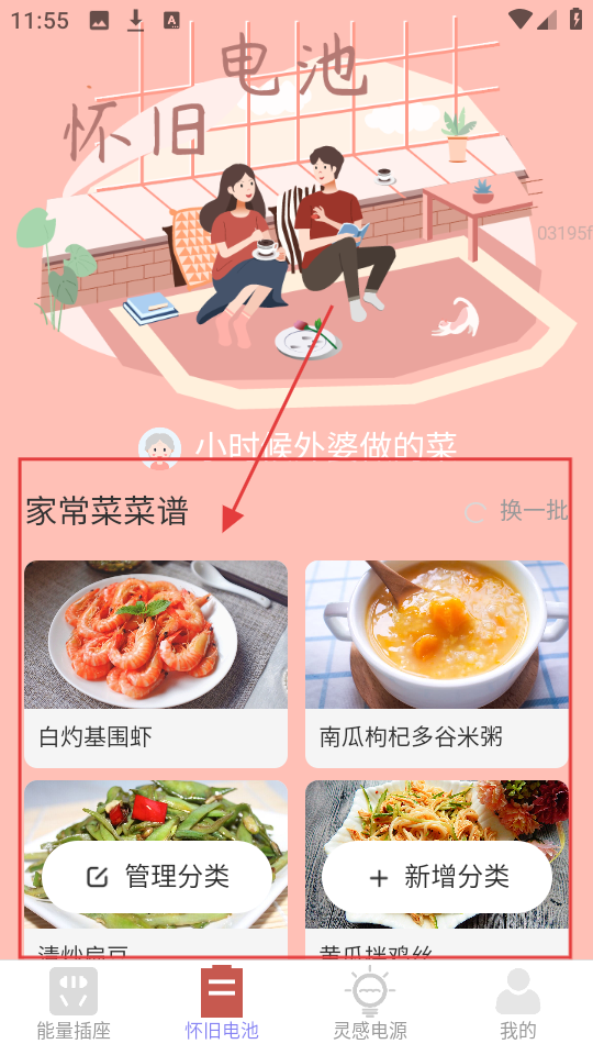 1、在怀旧电池页,可浏览家常菜菜谱,像【白灼基围虾】【南瓜枸杞多谷米粥】等,还能管理或新增分类。