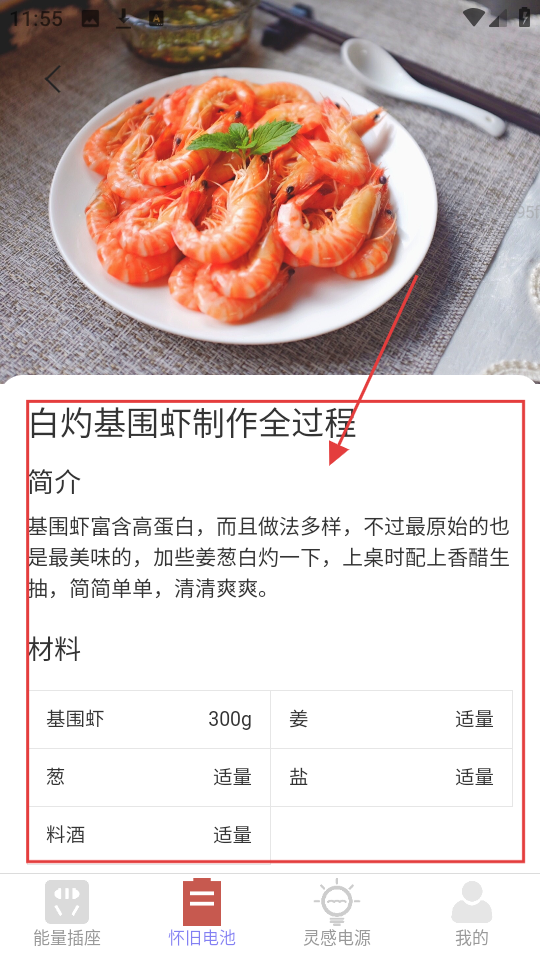 2、点进白灼基围虾菜谱,查看制作全过程,了解简介和所需材料,为烹饪做准备。